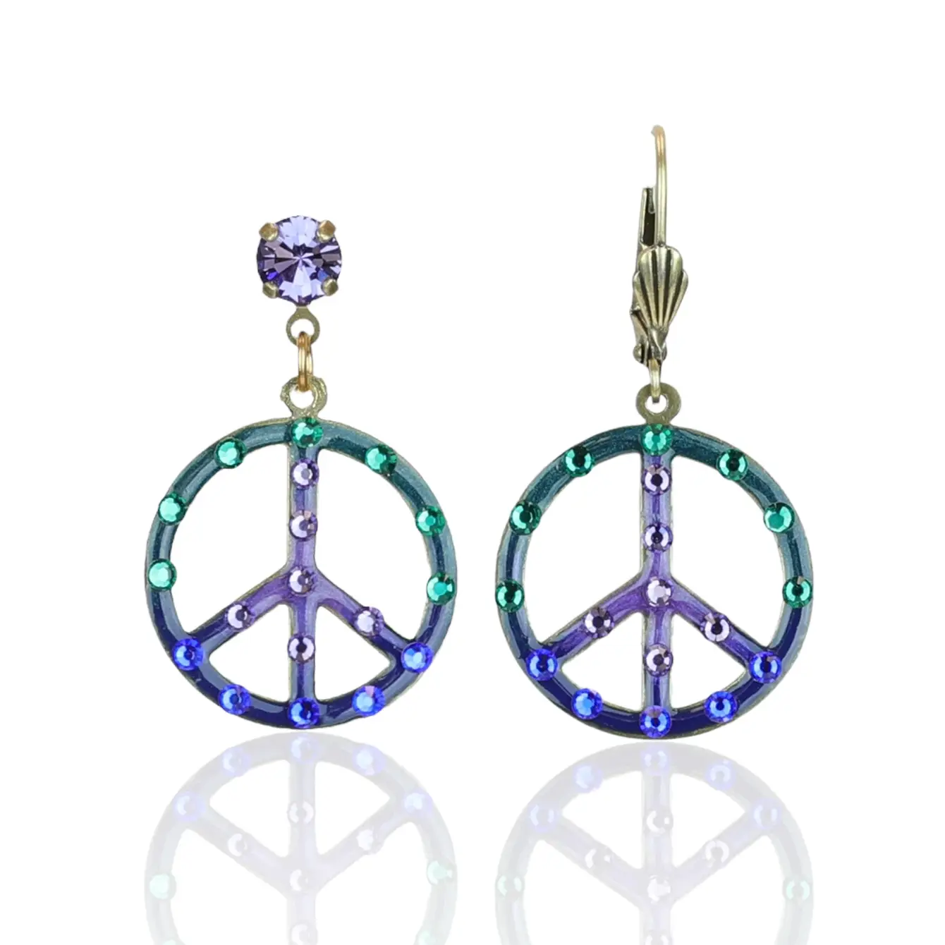 Leverback Option (right): Our round traditional peace symbol earrings are hand enameled in cool colors of green, blue, and purple with coordinating crystal color embellishments. A beautiful way to embrace the essence of being calm, cool and grounded.
